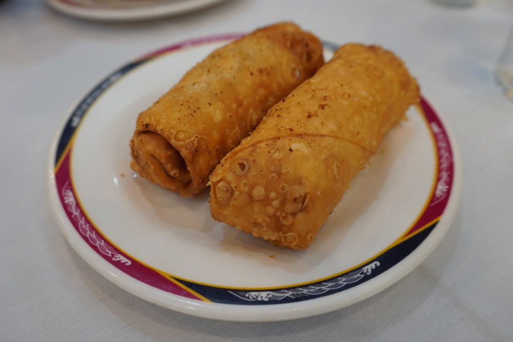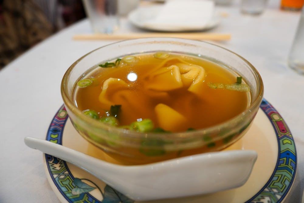 I’m seated at one of the square tables in the middle of the room and a friendly waitress comes over to ask if I want anything to drink. She places a metal teapot on the table and brings water over very quickly. When I pick up the menu I’m excited to see such a wide variety of options: They have everything from a beef flank hot pot to shark’s fin soup. Almost all of the main dishes on the menu are affordable (under $15 to $20), and their dim sum gets rave reviews, but I’m in the mood for a diverse array of appetizers. I ordered wonton soup ($2.95), egg rolls ($2.50), spring rolls ($3.00), and steamed shrimp dumplings ($2.75).