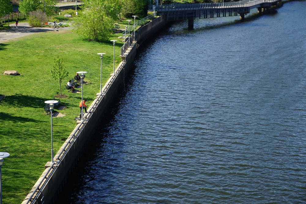 Sheng peers over the concrete bank into the river, waiting for a fish to take the bait. Natalia Castillo